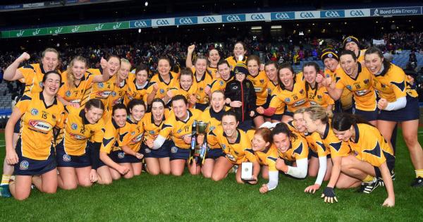 Clonduff Senior Camogie Team captain Paula O’Hagan lifts the Agnes O’Farrelly Cup
