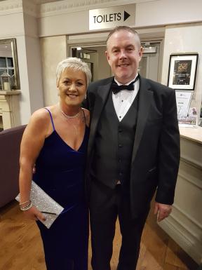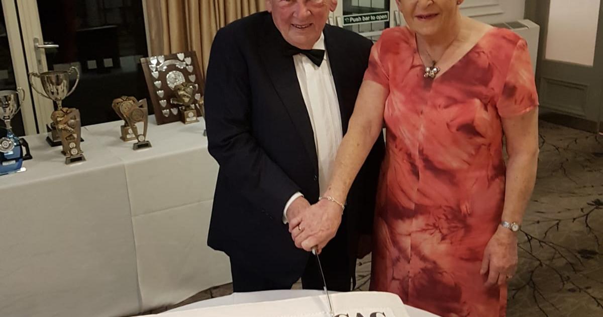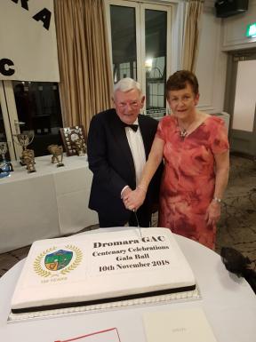 Cutting the cake at Dromara Gaelic Club’s centenary celebrations were Maureen McKay honorary member and Hugh O’Hare, a member of the ‘51 Junior Championship winning team.
